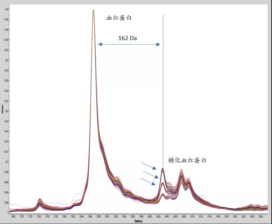 注:三种不同糖化率样本:6%,9%及14%,每种样本重复24次点样测试(CV分别为1.39%、0.71%及0.62%,R2=0.9992),共计72(3x 24)次测试质谱图叠加图