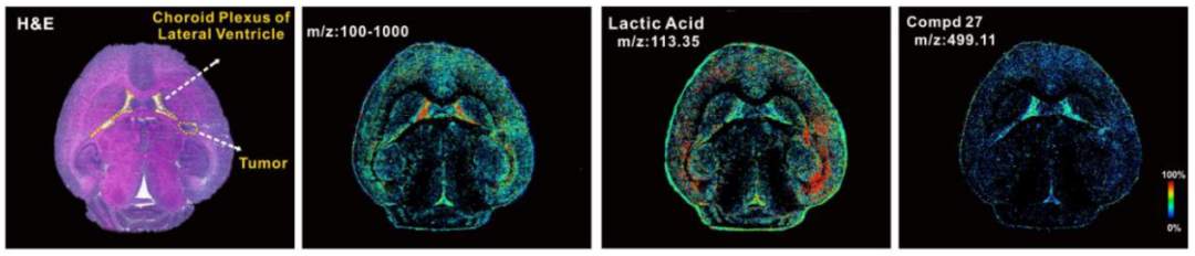 图1新型分子实体(Compd27)及其他小分子代谢物在小鼠脑部切片中的分布成像。最左侧显示的是经过H&E染色的切片照片,最右侧显示的是Compd27在切片样本中的质谱成像图(分辨率为:10um)