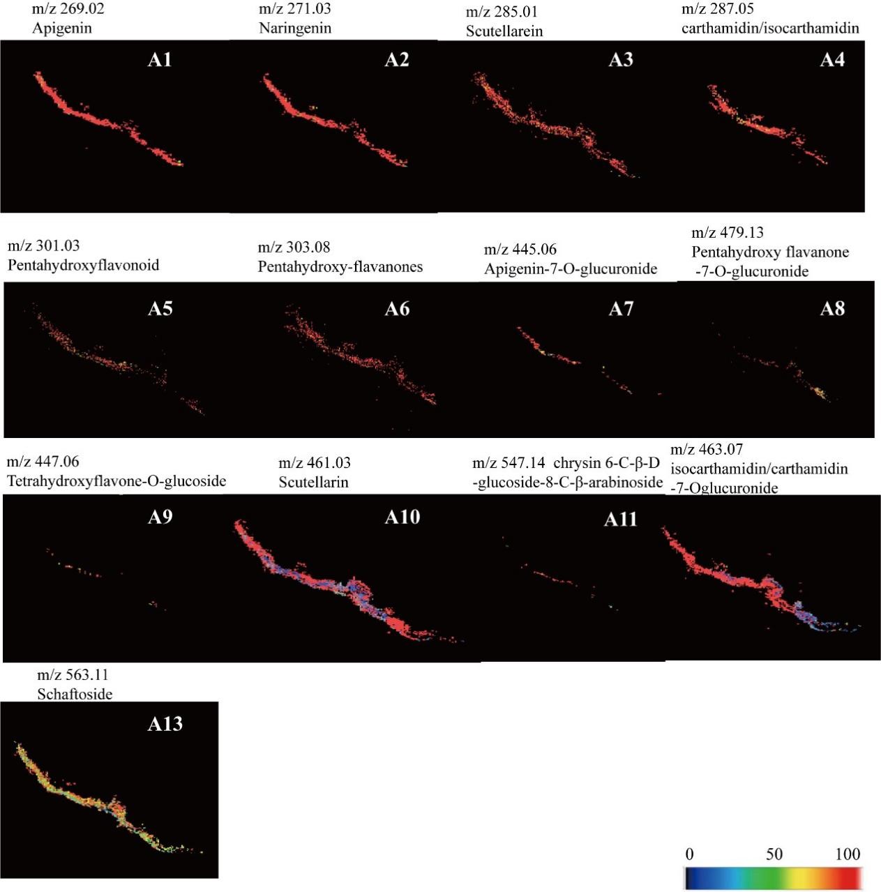图3:黄芩叶片中代表性代谢物质谱成像结果