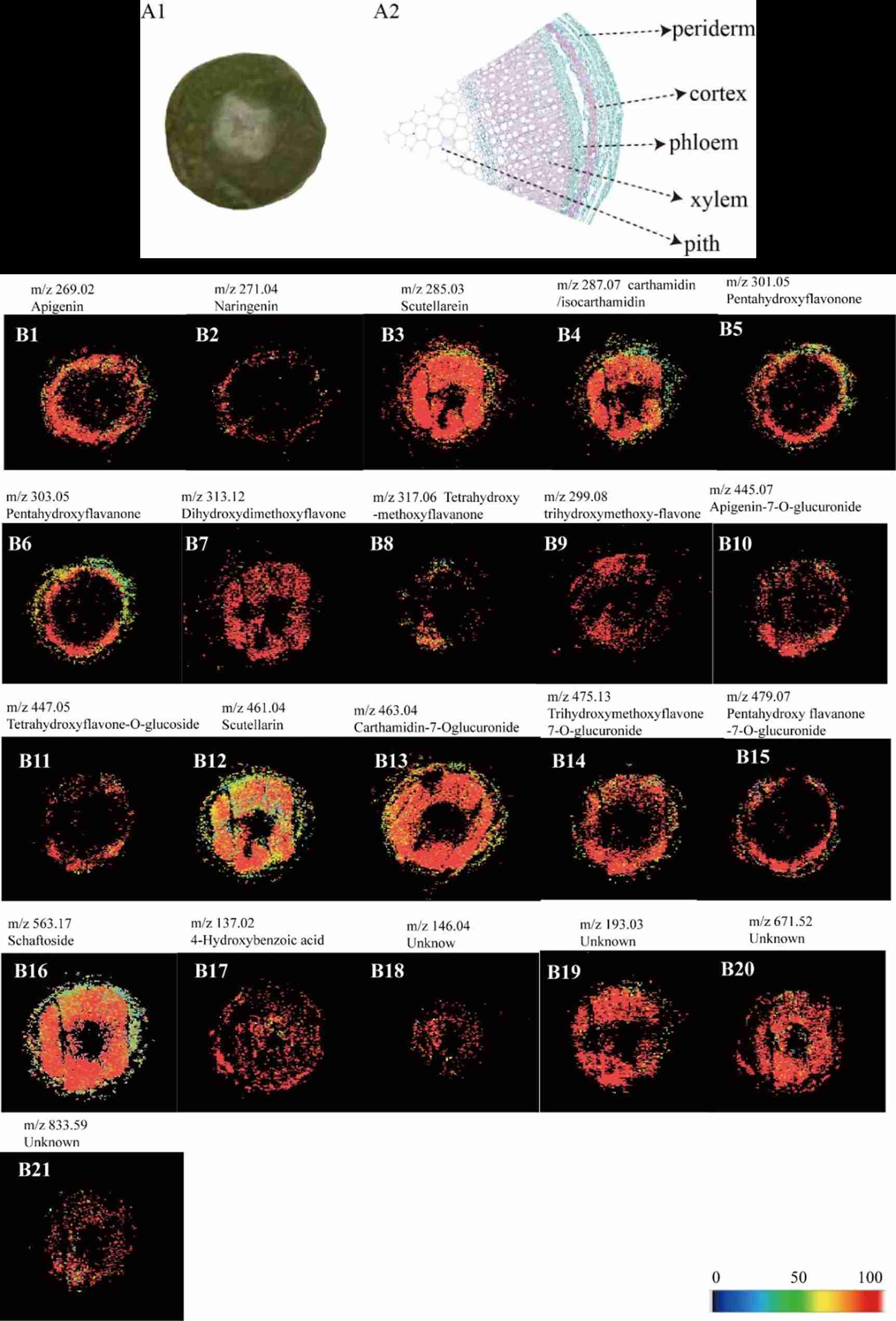 图2:黄芩茎光学(A)和代表性代谢物质谱成像(B)结果