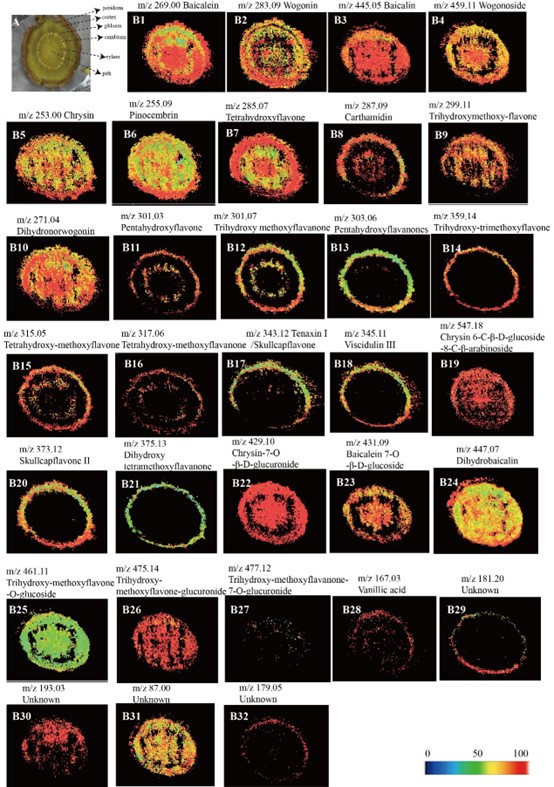 图1:黄芩根部的光学图像(A)和代表性代谢物质谱成像(B)结果