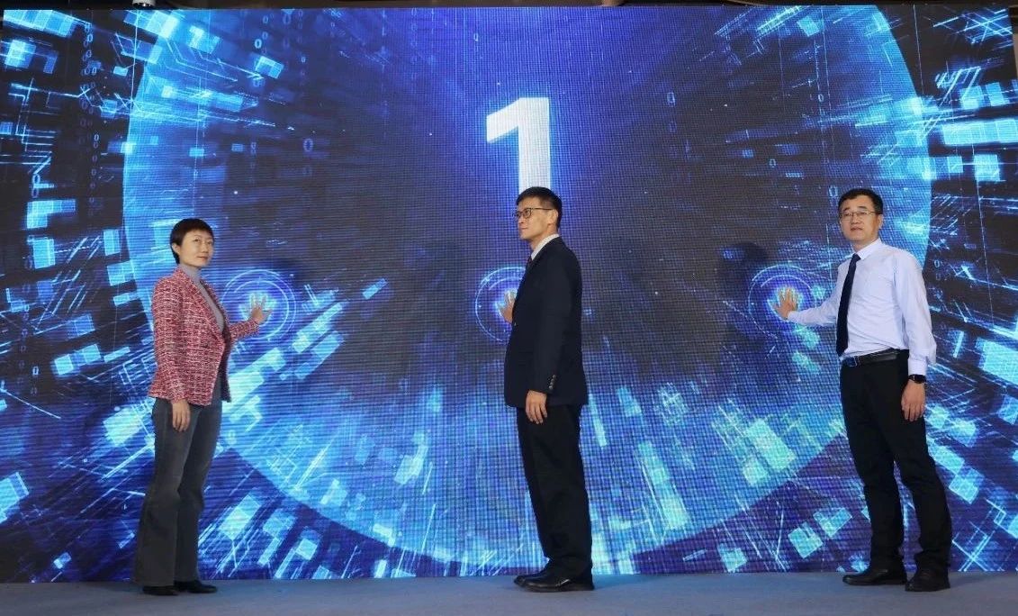 融智生物董事长、首席技术官周晓光(中),中科院生物物理所研究员李岩(左),融智生物总经理李运涛(右),共同为病源双维鉴定质谱新产品揭幕