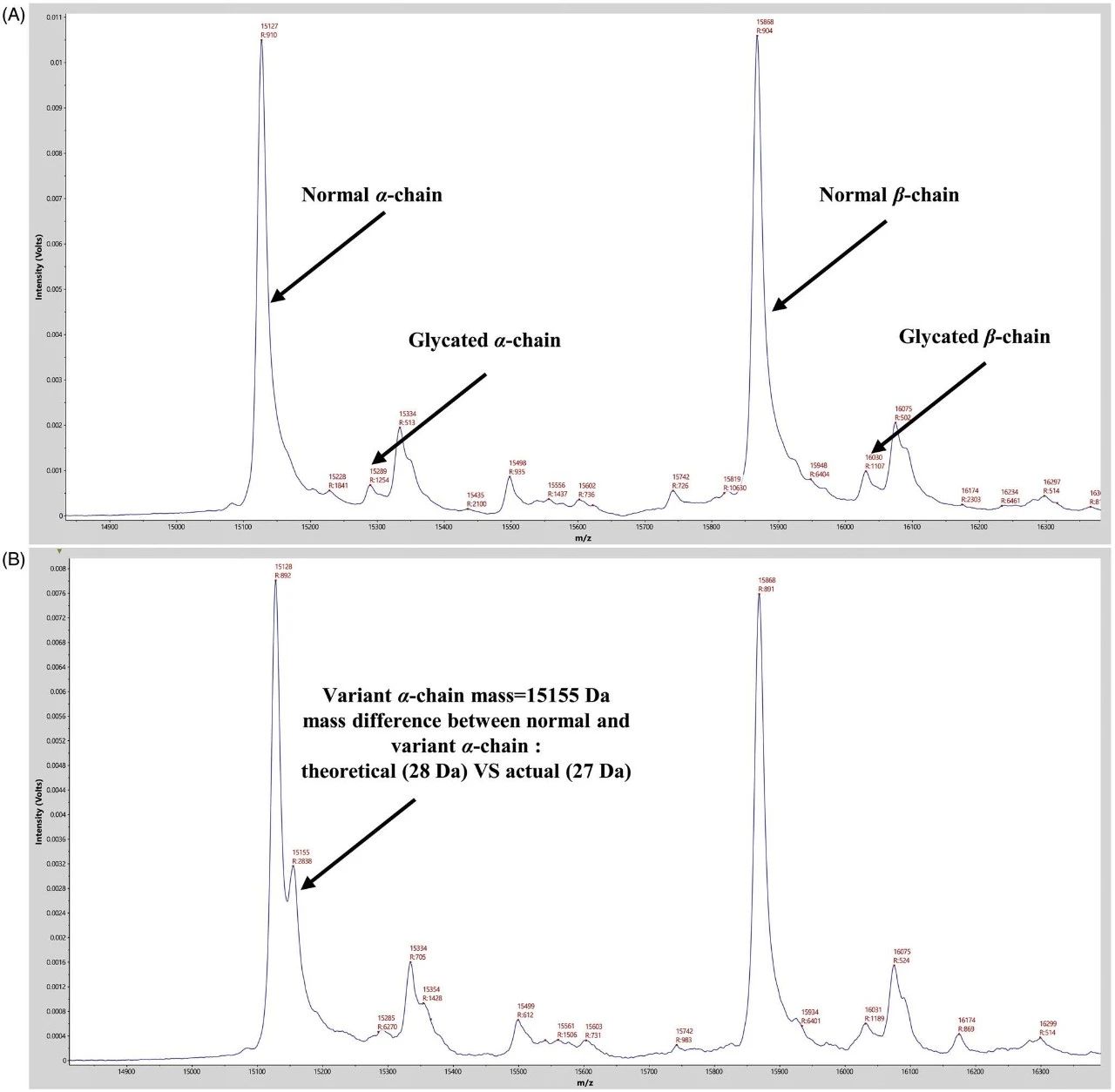 图. MALDI-TOF MS(QuanTOF)血红蛋白分析。(A)非变异样品的质谱图显示α-链(15127 Da)、β-链(15868 Da)以及相应的糖基化α-链(15289 Da)和糖基化β-链(16030 Da)。(B) Hb-柳州的质谱图显示一个变异的α-链峰(15155Da)。
